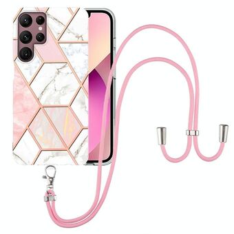 For Samsung Galaxy S22 Ultra 5G Electroplating Splicing Marble TPU Phone Case with Lanyard(Pink White)