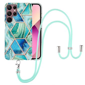 For Samsung Galaxy S22 Ultra 5G Electroplating Splicing Marble TPU Phone Case with Lanyard(Blue Green)
