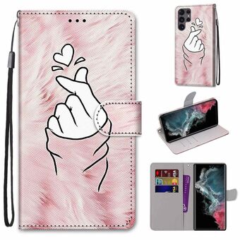 Θήκη τηλεφώνου Samsung Galaxy S22 Ultra 5G από δέρμα PU με οριζόντιο άνοιγμα, ανάγλυφη υφή, πολύχρωμο σχέδιο (ροζ-πράσινα βελάκια) με βάση για στήριξη, θήκες για κάρτες, πορτοφόλι και κορδόνι.