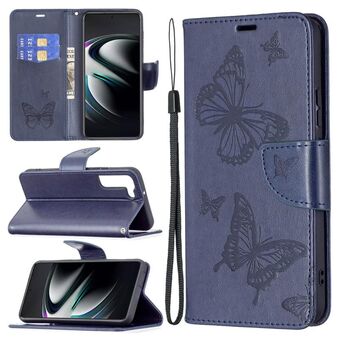 Θήκη τηλεφώνου δερμάτινη με ανάγλυφο σχέδιο δύο πεταλούδων για Samsung Galaxy S22 Ultra 5G, με βάση στήριξης, θήκη για κάρτες, πορτοφόλι και λουρί (Μωβ)