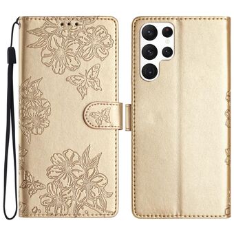 For Samsung Galaxy S22 Ultra 5G Cherry Blossom Butterfly Skin Feel Embossed PU Phone Case(Gold)