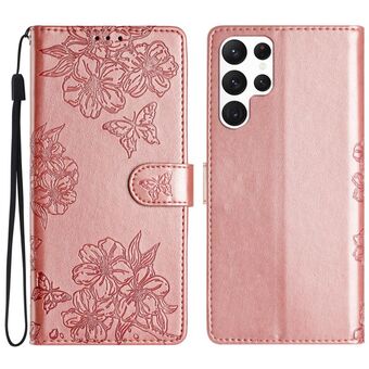 For Samsung Galaxy S22 Ultra 5G Cherry Blossom Butterfly Skin Feel Embossed PU Phone Case(Rose Gold)