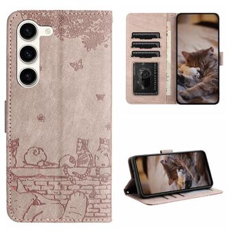 Θήκη κινητού Samsung Galaxy S23 με ανάγλυφο σχέδιο γάτας από δέρμα με κορδόνι (Μπεζ)