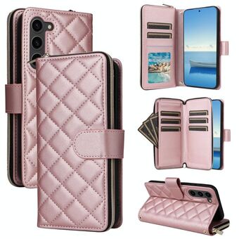 Θήκη κινητού Samsung Galaxy S23 5G, δερμάτινη, με λουρί, φερμουάρ, ρόμβους, αγκράφα και σχέδιο crossbody (μπεζ)