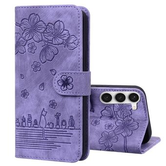 For Samsung Galaxy S23+ 5G Cartoon Sakura Cat Embossed Leather Phone Case(Purple)