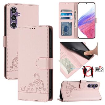 Θήκη κινητού τηλεφώνου Samsung Galaxy S23 FE 5G από PU με ανάγλυφο σχέδιο γάτας και καρδιάς, με λουρί καρπού (Ροζ)