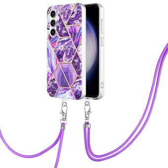 For Samsung Galaxy S23 FE 5G Electroplating IMD Splicing Dual-side Marble TPU Phone Case with Lanyard(Light Purple)