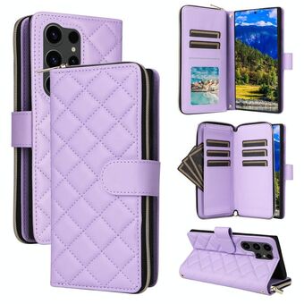 Θήκη κινητού Samsung Galaxy S23 Ultra 5G, δερμάτινη, με λουρί, φερμουάρ, ρόμβους, αγκράφα και ιμάντα ώμου (Μωβ)