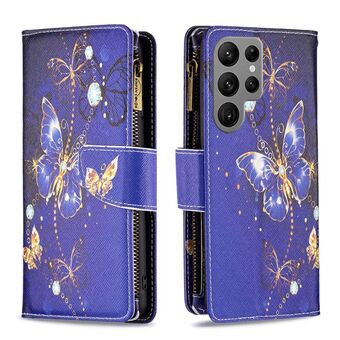 Θήκη τηλεφώνου Samsung Galaxy S23 Ultra 5G από δέρμα με φερμουάρ και σχέδιο ζωγραφικής σε χρώμα (Μωβ Πεταλούδα)