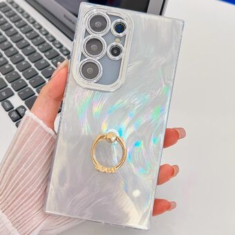 For Samsung Galaxy S23 Ultra 5G Plating Glitter Texture Ring Holder TPU Phone Case with Lens Film(White Shell Pattern)