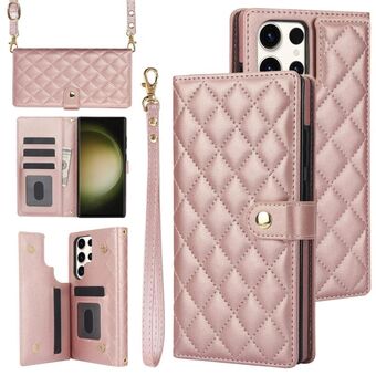 For Samsung Galaxy S23 Ultra 5G Crossbody Multifunction Rhombic Leather Phone Case(Rose Gold)