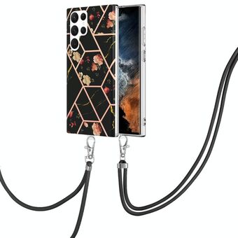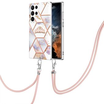 For Samsung Galaxy S23 Ultra 5G Splicing Marble Flower IMD TPU Phone Case with Lanyard(Crown)