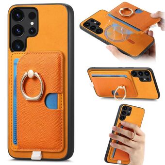 For Samsung Galaxy S23 Ultra 5G Retro Cross Leather Ring Side Insert Card Bag MagSafe Phone Case(Yellow)