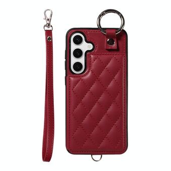 For Samsung Galaxy S24 5G Rhombic Texture Card Bag Phone Case with Short Lanyard(Wine Red)