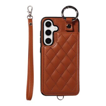 For Samsung Galaxy S24 5G Rhombic Texture Card Bag Phone Case with Short Lanyard(Brown)