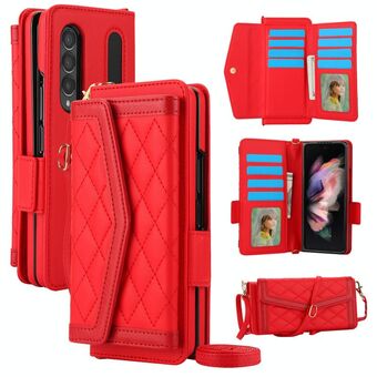 For Samsung Galaxy Z Fold4 Splicing Rhombic Texture Card Holder Phone Case with Lanyard, Not Included Pen(Red)