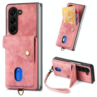 Για Samsung Galaxy Z Fold6 5G Ρετρό κάρτα πορτοφόλι πτυσσόμενο δερμάτινη θήκη τηλεφώνου με λουράκι (ροζ)