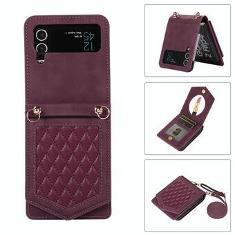 For Samsung Galaxy Z Flip4 5G Rhombic Texture RFID Phone Case with Lanyard & Mirror(Purple)