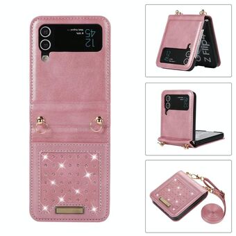 Για Samsung Galaxy Z Flip4 Τρεις-πτυχής RFID δερμάτινη θήκη τηλεφώνου με κορδόνι (ροζ χρυσό)
