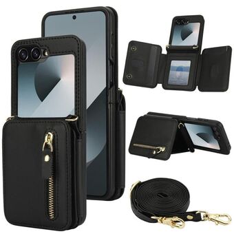 Θήκη κινητού τηλεφώνου AwQuer για Samsung Galaxy Z Flip6, τσάντα crossbody με φερμουάρ και πορτοφόλι από δέρμα λύτσι (Μαύρο) (Awquer)