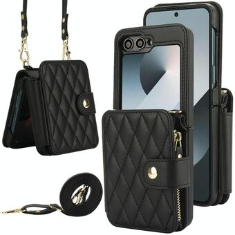 For Samsung Galaxy Z Flip6 Crossbody Rhombus Wallet Bag Folding Phone Case with Lanyard(Black)