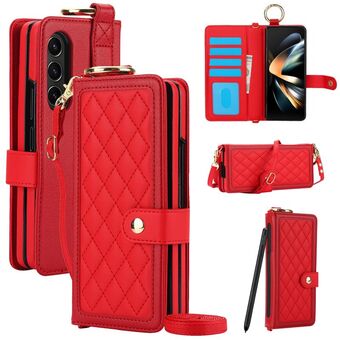 For Samsung Galaxy Z Fold4 Splicing Rhombic Texture Phone Case with Long & Short Lanyard, Not Included Pen(Red)