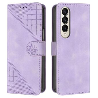 For Samsung Galaxy Z Fold4 YX0080 Grid Butterfly Embossed Pattern Flip Leather Phone Case with Lanyard(Light Purple)