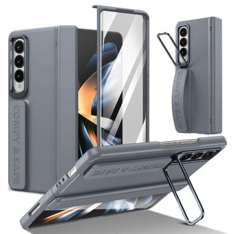 For Samsung Galaxy Z Fold4 Film Integrated Lens Frame Bracket Phone Case with Wristband(Grey)