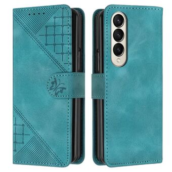 For Samsung Galaxy Z Fold4 YX0080 Grid Butterfly Embossed Pattern Flip Leather Phone Case with Lanyard(Light Blue)