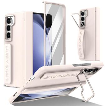 For Samsung Galaxy Z Fold5 Film Integrated Lens Frame Bracket Phone Case with Wristband(Apricot)