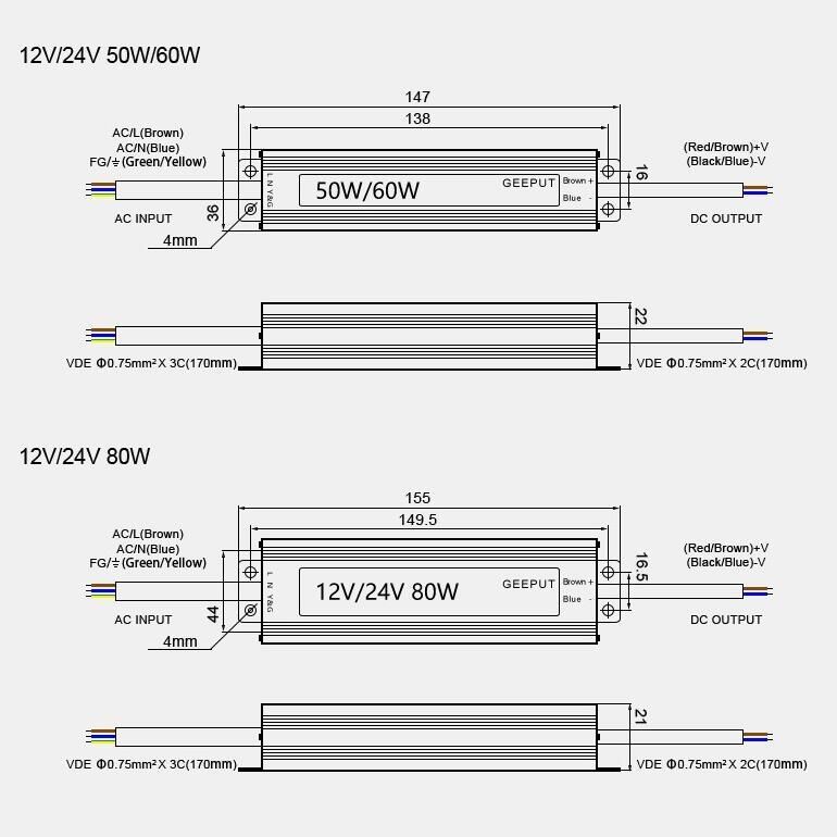 10. Wiring mode: AC input wire (brown L live wire, blue N neutral wire, yellow and green two-color ground wire), DC output wire (brown/red +V positive pole, blue/black -V negative pole)