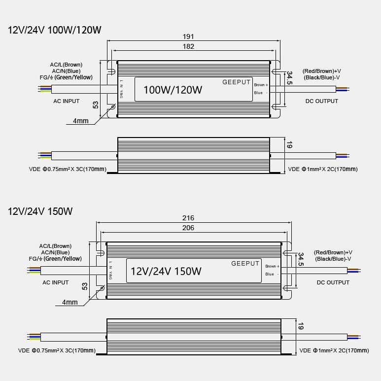 10. Wiring mode: AC input wire (brown L live wire, blue N neutral wire, yellow and green two-color ground wire), DC output wire (brown/red +V positive pole, blue/black -V negative pole)