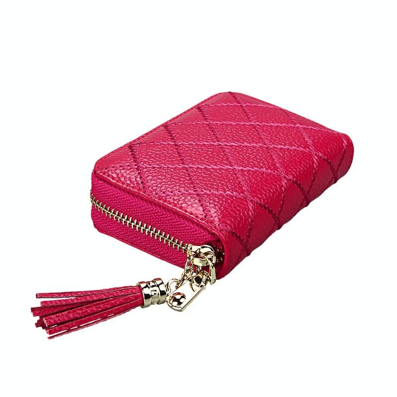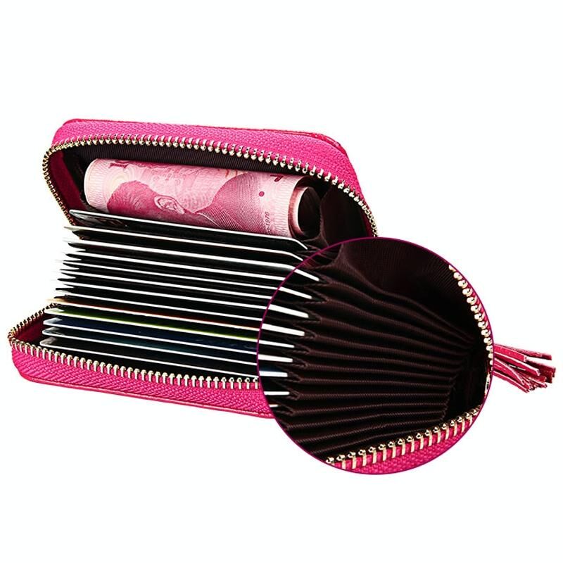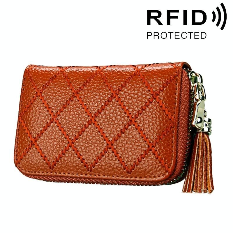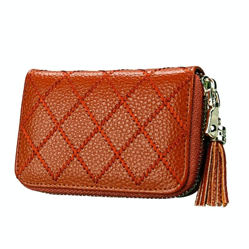 Γνήσιο δέρμα αγελάδας Δέρμα πλέγμα υφή φερμουάρ κάτοχος κάρτας πορτοφόλι RFID μπλοκάρισμα κάρτα τσάντα προστατεύει υπόθεση πορτοφόλι κέρμα με κρεμαστό κόσμημα φούντα & 15 υποδοχές κάρτας για τις γυναίκες, Μέγεθος: 11.1 * 7.9 * 3.5cm (καφέ)