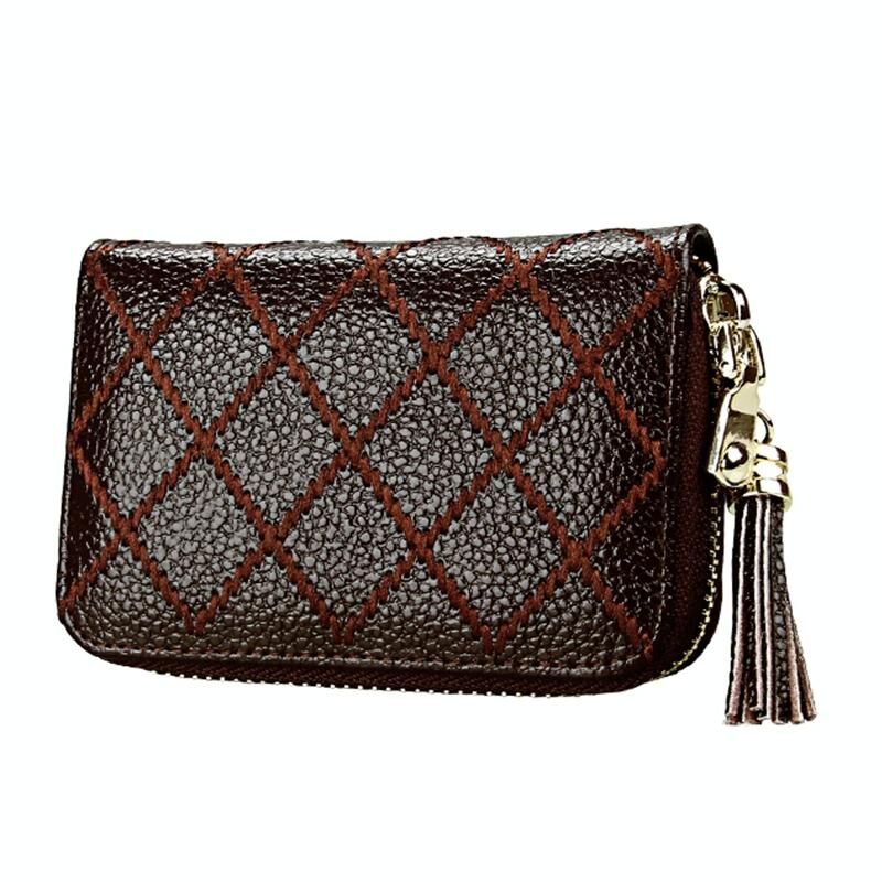 Γνήσιο δέρμα αγελάδας Δέρμα πλέγμα υφή φερμουάρ κάτοχος κάρτας πορτοφόλι RFID μπλοκάρισμα κάρτα τσάντα προστατεύει υπόθεση πορτοφόλι κέρμα με κρεμαστό κόσμημα φούντα & 15 υποδοχές κάρτας για τις γυναίκες, Μέγεθος: 11.1 * 7.9 * 3.5cm (Καφές)