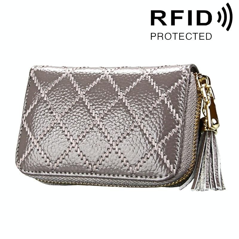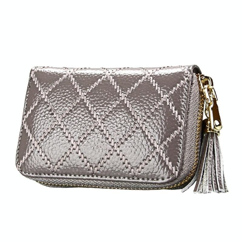Γνήσιο δέρμα αγελάδας Δέρμα πλέγμα υφή φερμουάρ κάτοχος κάρτας πορτοφόλι RFID μπλοκάρισμα κάρτα τσάντα προστατεύει υπόθεση πορτοφόλι κέρμα με κρεμαστό κόσμημα φούντα & 15 υποδοχές κάρτας για τις γυναίκες, Μέγεθος: 11.1 * 7.9 * 3.5cm (γκρι)
