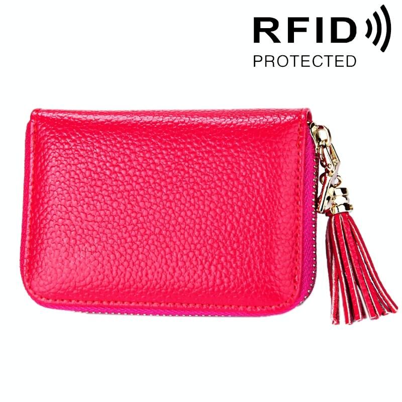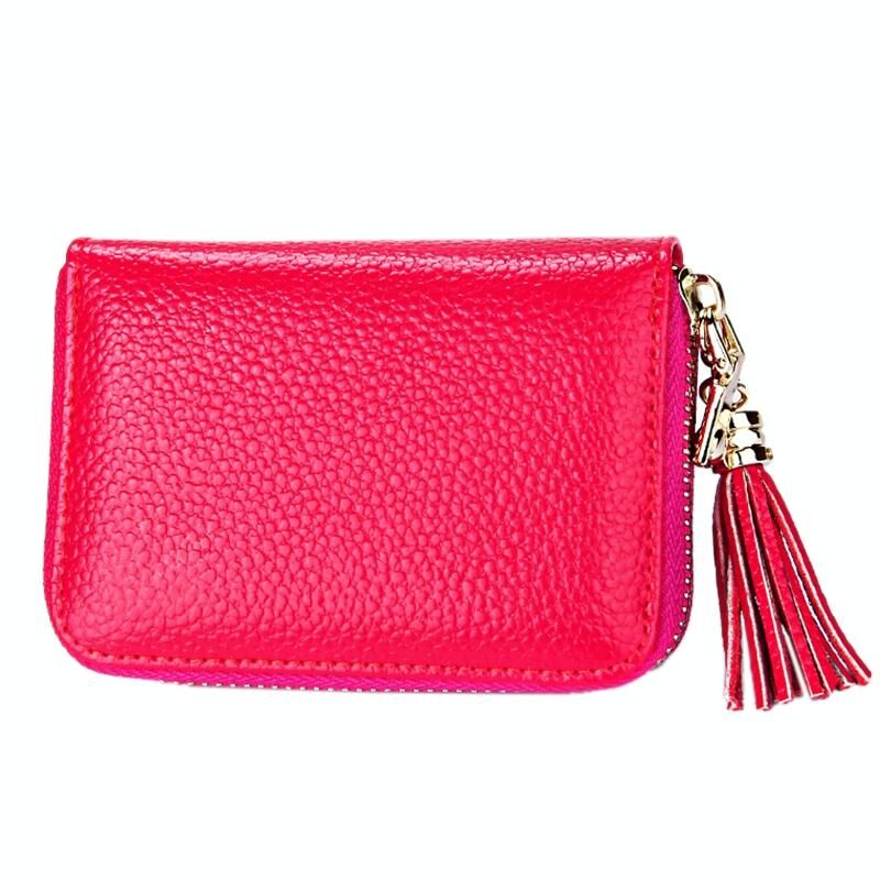 Γνήσιο δέρμα αγελάδας Αμιγές χρώμα φερμουάρ κάτοχος κάρτας πορτοφόλι RFID μπλοκάρισμα κάρτα τσάντα προστατεύει υπόθεση πορτοφόλι κέρμα με κρεμαστό κόσμημα φούντα & 15 υποδοχές για κάρτες για τις γυναίκες, Μέγεθος: 11.1 * 7.6 * 3.5cm (Magenta)