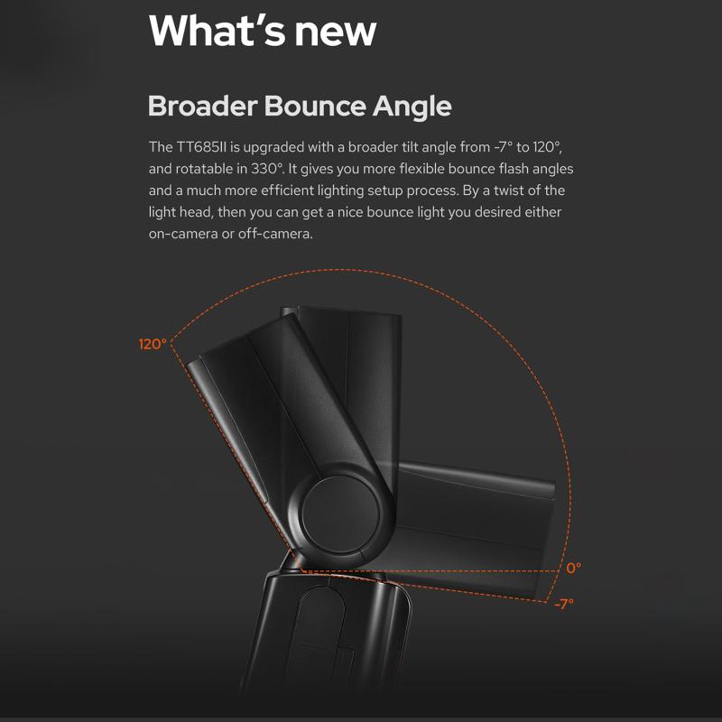 3. Powerful functions: TT685II has HSS (up to 1/8000s), FEC, FEB, rear curtain sync and other functions in TTL mode. In manual mode, there are 22 levels of power output from 1/1 to 1/128 for you to adjust freely. Meanwhile, TT685II has two zoom modes: Auto/Manual. Flash coverage is 20-200mm.
