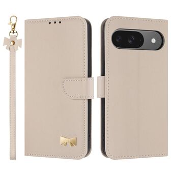 For Google Pixel 9a Metal Bow Leather Phone Case with Hand Strap(Apricot)