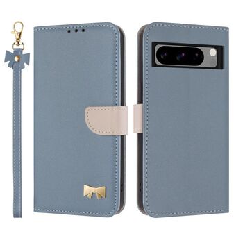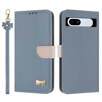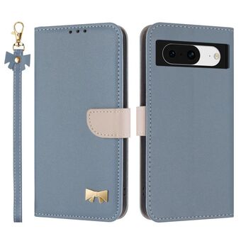 For Google Pixel 8 Metal Bow Leather Phone Case with Hand Strap(Light Blue)