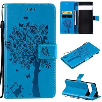 Για Google Pixel 6 Tree & Cat ανάγλυφο μοτίβο οριζόντια Flip δερμάτινη θήκη με θήκη & υποδοχές για κάρτες & πορτοφόλι & κορδόνι (μπλε)