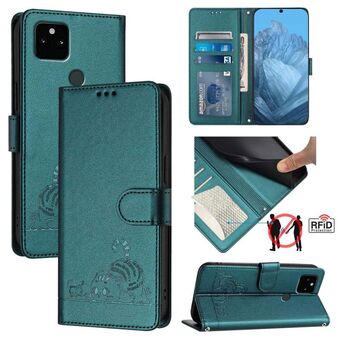 For Google Pixel 5a 5G Cat Rat Embossed Pattern RFID Leather Phone Case with Lanyard(Peacock Green)