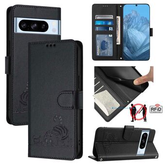 For Google Pixel 8 Cat Rat Embossed Pattern RFID Leather Phone Case with Lanyard(Black)