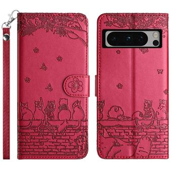 For Google Pixel 8 Pro Cat Embossing Pattern Leather Phone Case with Lanyard(Red)