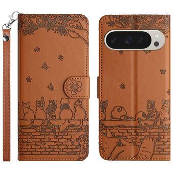 For Google Pixel 9 Pro XL Cat Embossing Pattern Leather Phone Case with Lanyard(Brown)