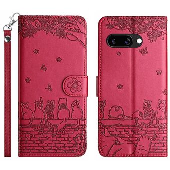 For Google Pixel 9a Cat Embossing Pattern Leather Phone Case with Lanyard(Red)