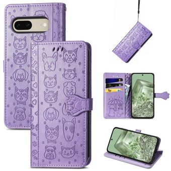For Google Pixel 7 Cat and Dog Embossed Leather Phone Case(Purple)