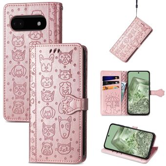 For Google Pixel 9a Cat and Dog Embossed Leather Phone Case(Rose Gold)