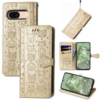 For Google Pixel 7a Cat and Dog Embossed Leather Phone Case(Gold)