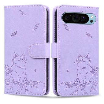 For Google Pixel 9 / 9 Pro Cute Cat Embossed Leather Phone Case(Purple)