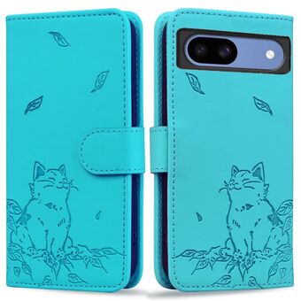 For Google Pixel 8a Cute Cat Embossed Leather Phone Case(Lake Blue)